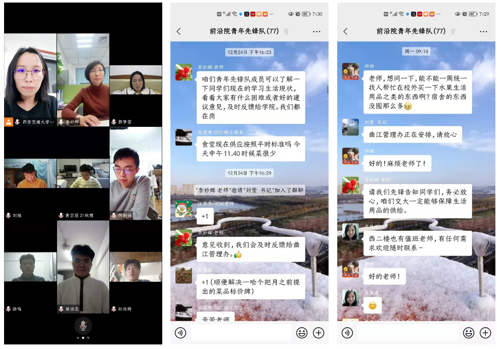 曲江校区实施封闭管理初期,各种生活物品准备不足、少数民族学生缺少清真食品、学生身体不适却无备用药物等问题凸显,青年志愿者先锋队在同学中普及防控知识、呼吁大家遵守防疫规定、搜集大家各项需求与困难,得益于他们信息反馈及时,学院及时答复、迅速精准解决了同学们的需求,落实服务保障。