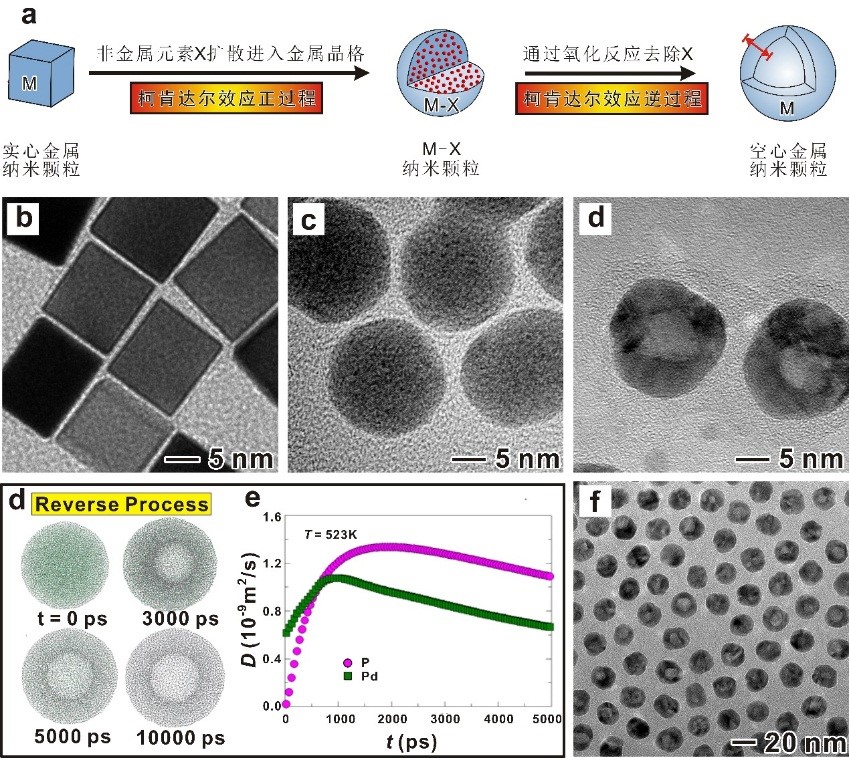 最近,必赢的金明尚教授在柯肯达尔效应的研究中有了全新的发现:该研究团队设计并成功实现了柯肯达尔效应的逆过程,通过将该效应的正逆过程相结合,如图1a所示,通过X元素的加入和随后的去除,可以使实心金属纳米颗粒转变为中空金属纳米颗粒,而且在转变过程中几乎没有质量损失。