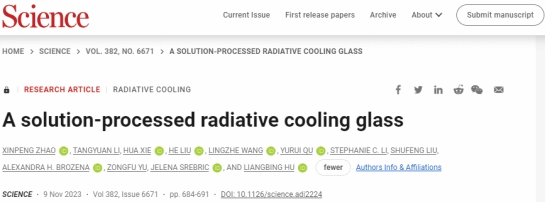 2023年11月9日,美国马里兰大学材料科学与工程系胡良兵教授团队在Science期刊发表题为“A solution-processed radiative cooling glass”的辐射制冷技术研究论文。胡良兵教授为论文通讯作者,论文共同第一作者为赵新朋博士、李堂源博士、谢华博士、刘鹤博士,均为西安交通大学校友。其中,李堂源博士毕业于西安交通大学bwin,导师为娄晓杰教授。